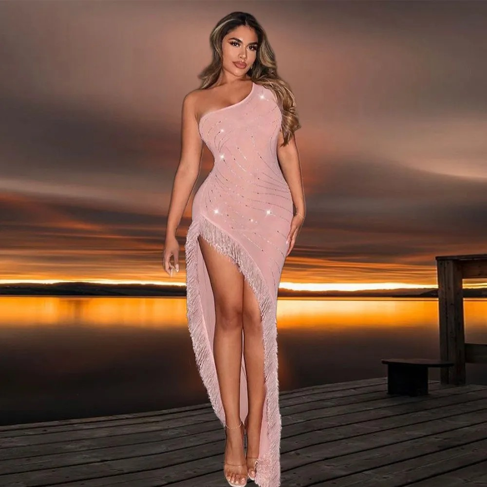 This exquisite tassel dress features a hot stamping design and a fashionable slanted shoulder for a captivating and unique look. The irregular skirt adds a touch of edginess to the overall design, making this a must-have piece for any fashion-forward individual. Don't miss out on this hot stamping tassel dress and slanted shoulder irregular skirt!