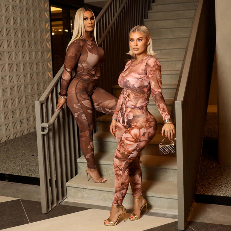 This set features a round neck top with long sleeves paired with high-waisted, form-fitting pants that hug the hips, showcasing a stylish printed design. Perfect for a confident and polished look.